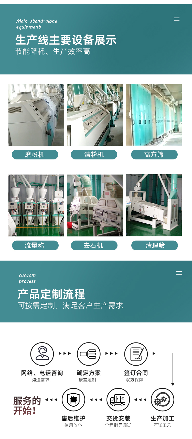 300噸級面粉機組清理流程采用四篩兩打,兩去石, 次挑選,三次磁選,兩次著水的完善工藝。面粉設備制粉流程采用強調分級的中長粉路出粉法,主要工藝為4-5皮,6-8心,1-2渣,1-2尾,3-6清粉,3-4打麩。