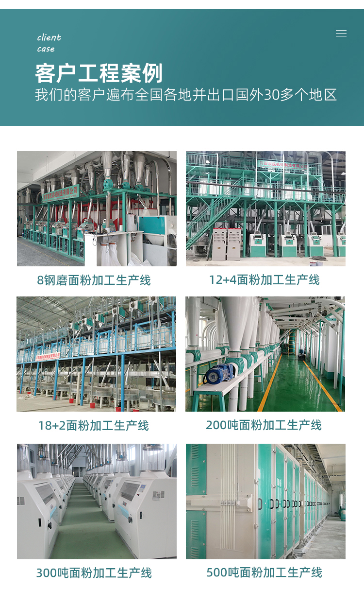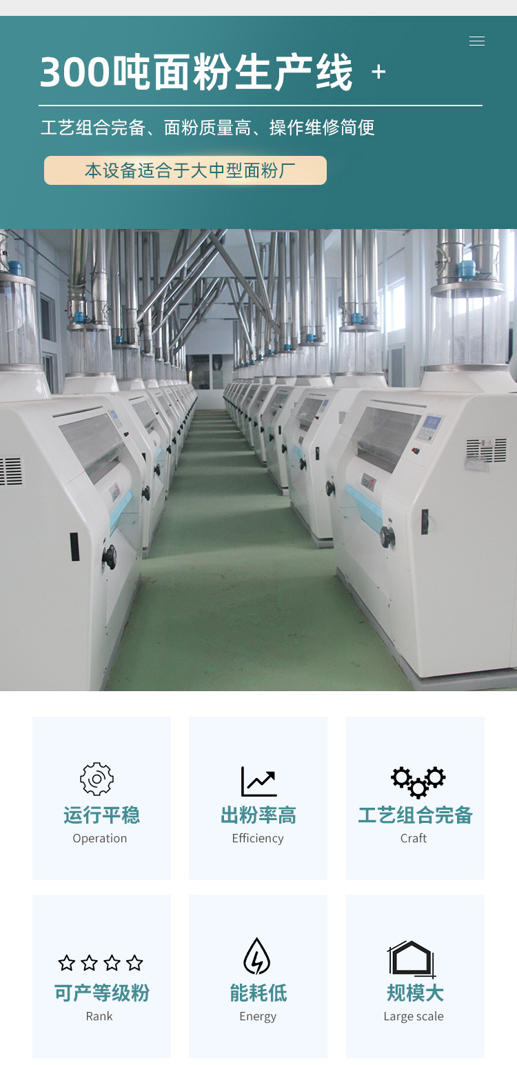 300噸級面粉機組其制粉設備先進,工藝組合完備、分級效果好、面粉質量高、產量高,出粉率高,操作維修簡便,面粉廠檔次高、規(guī)模大,可以生產等級粉.專用粉,還可以精標聯產,本設備特別適合于大中型面粉廠。